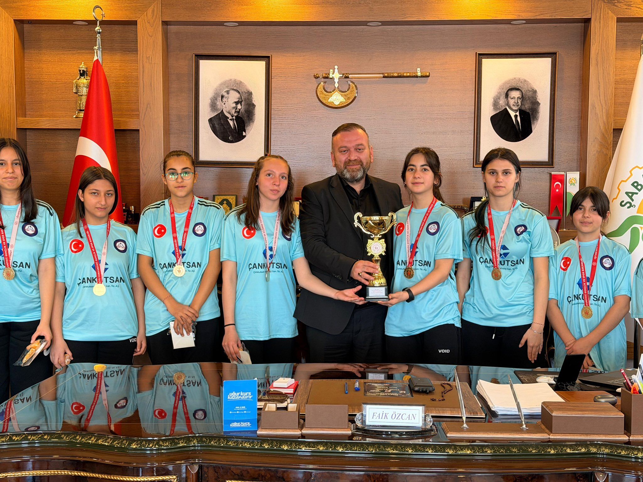 “Şehit Murat Somuncu Ortaokulu Futsal Takımımız, Çankırı’da düzenlenen müsabakalarda il birincisi olarak bizleri gururlandırdı. Kıymetli öğrencilerimiz kupalarıyla birlikte belediyemizi ziyaret ettiler. Şimdi hedef Bartın’da yapılacak Bölge Şampiyonası! Geleceğimiz olan yavrularımıza yürekten başarılar diliyor, emeği geçen öğretmenlerimize ve ailelerimize teşekkür ediyorum. Şabanözü sizinle gurur duyuyor” ifadelerini kullandı.
