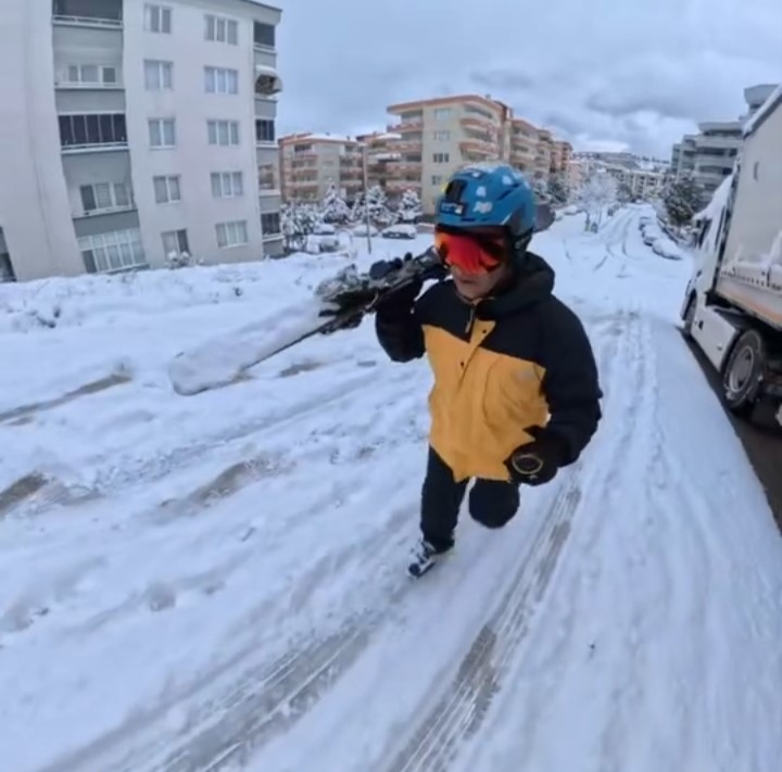 Sabah saatlerinde evinden çıkan vatandaş, yoğun kar yağışı nedeniyle kapanan ve araç geçişinin zorlaştığı sokaklarda yürümek yerine kayak yapmayı tercih etti. Karla kaplı yollarda rahatlıkla ilerleyen vatandaş, hem spor yaptı hem de işe gitmenin farklı bir yolunu deneyimledi. O anları cep telefonu kamerasıyla kaydeden vatandaş, görüntüleri sosyal medya hesaplarında paylaştı.